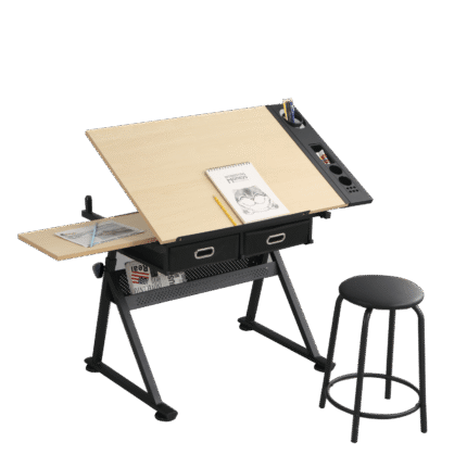 adjustable drawing drafting table desk with 2 drawers for home office and school with stool(wood)