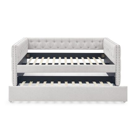 Daybed with Trundle Upholstered Tufted Sofa Bed, with Button and Copper Nail on Square Arms,Full Daybed & Twin Trundle, Beige(85″x57″x31.5″)