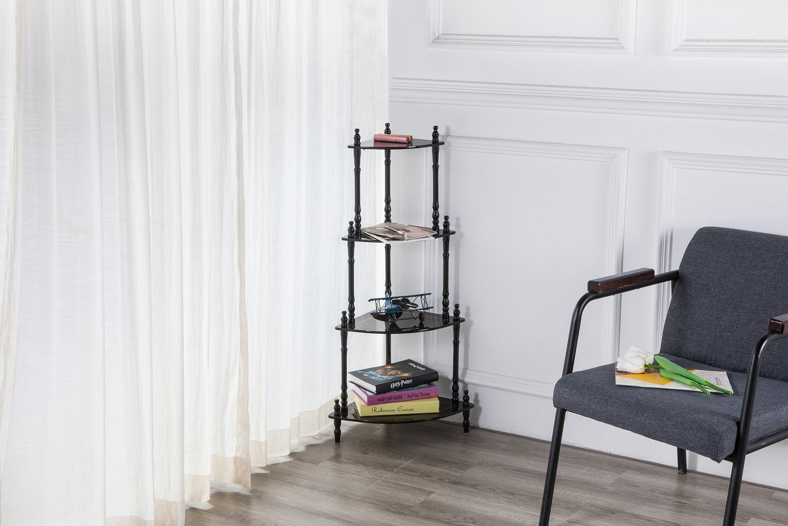 - Use the 4-shelves to store decorative items, books, parlor games and more