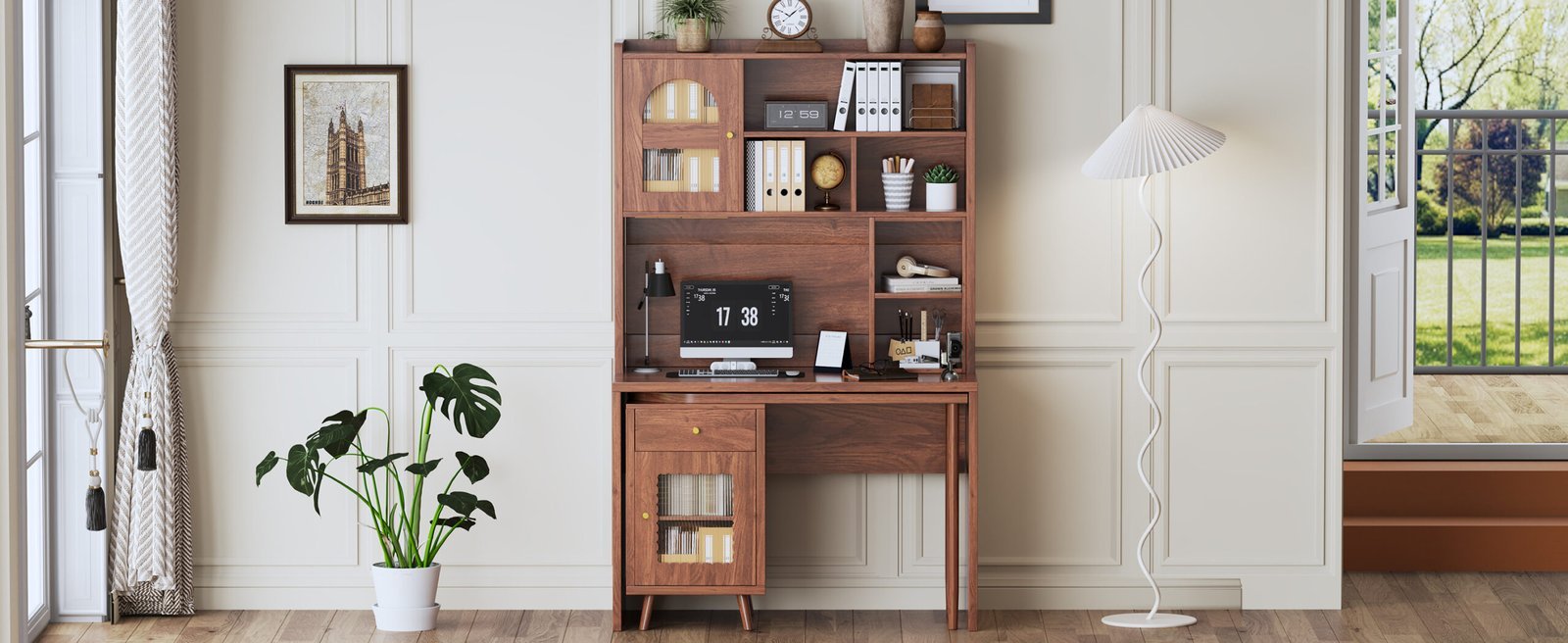 • 3.【Writing Desk with Storage Cabinets】This desk features 2 storage cabinets with elegant transparent glass doors, combining both style and functionality. The glass doors help keep your personal items dust-free while allowing you to easily see and access what’s inside—perfect for organizing and protecting your belongings with a touch of sophistication.