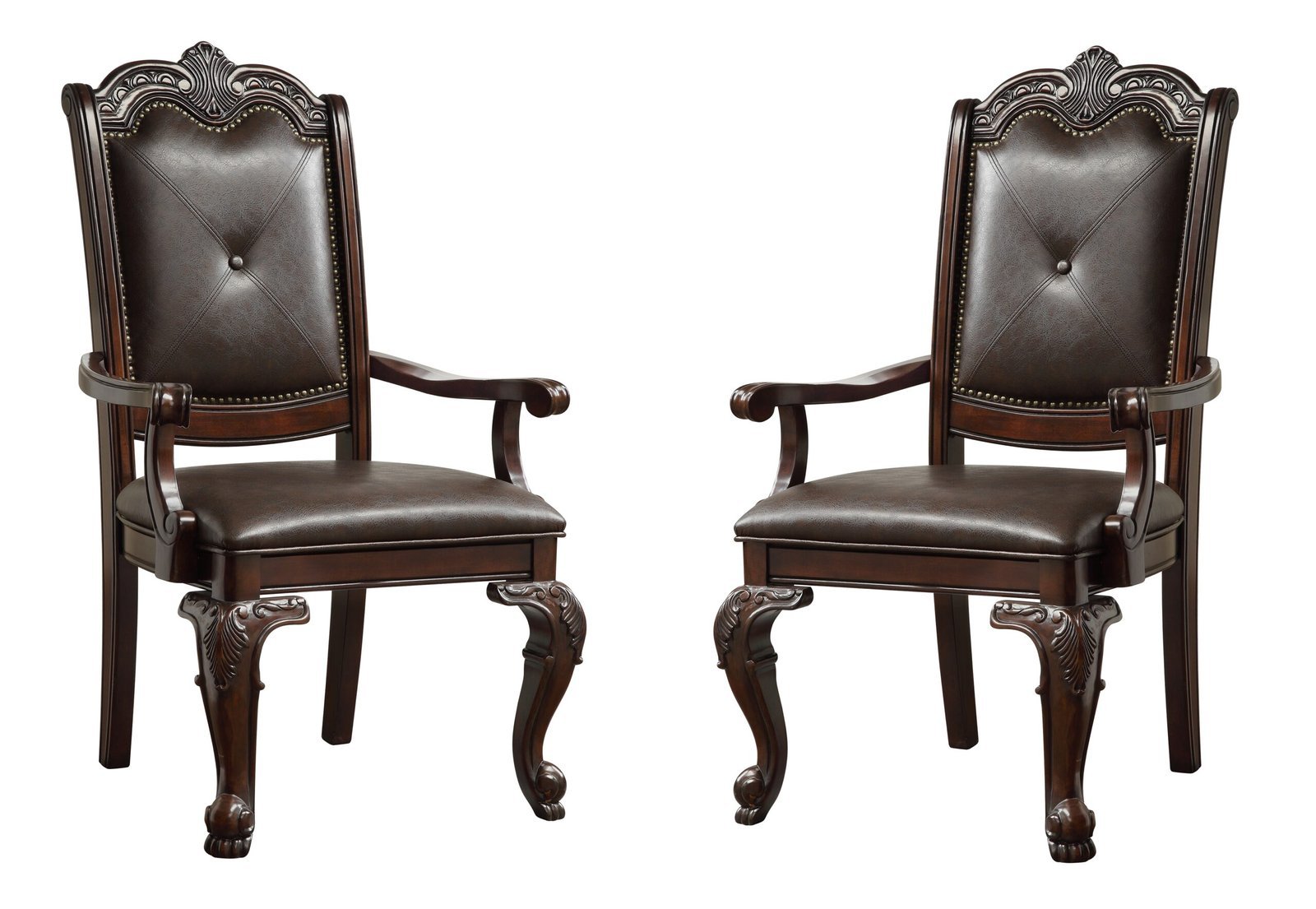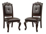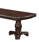 Formal 9pc Rectangular Dining Table 18″ Extendable Leaf Side Chair Armchair Rich Dark Brown Finish Faux Leather Upholstery Intricately Carved Double Pedestal Base Solid Wood Dining Set