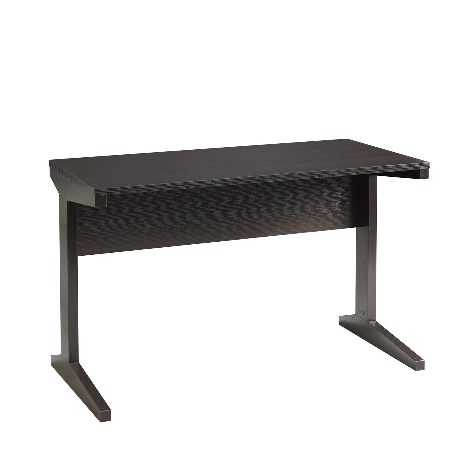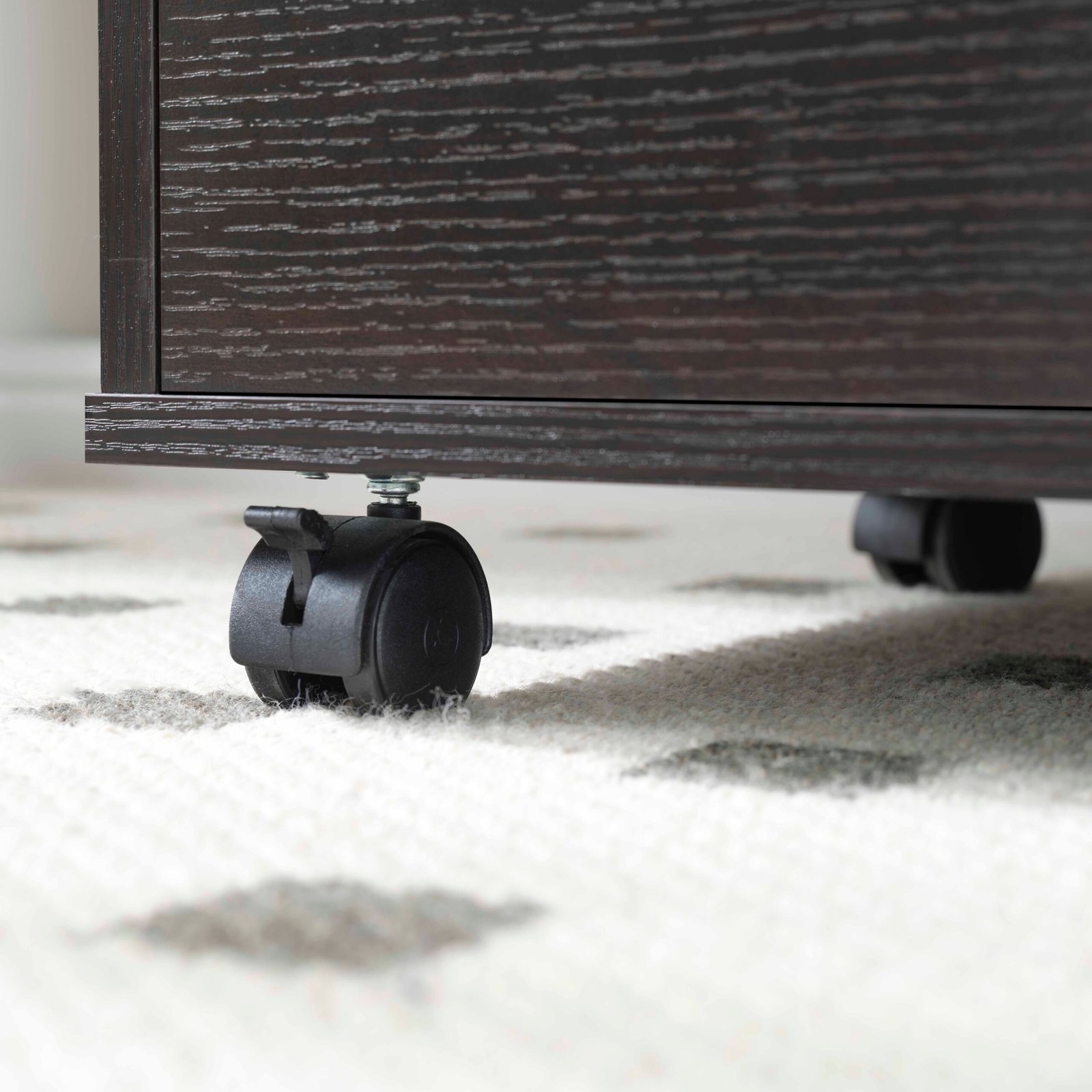 This compact desk with matching detached file cabinet provides storage, table top space and style. The desk is finished on the back with tall modesty panel. The mobile file cabinet has locking wheels and features two drawers on pre-assembled 3/4 metal glides. A small cubby allows for easy grabbing of everyday items. Wheel out the file cabinet for extra table space.