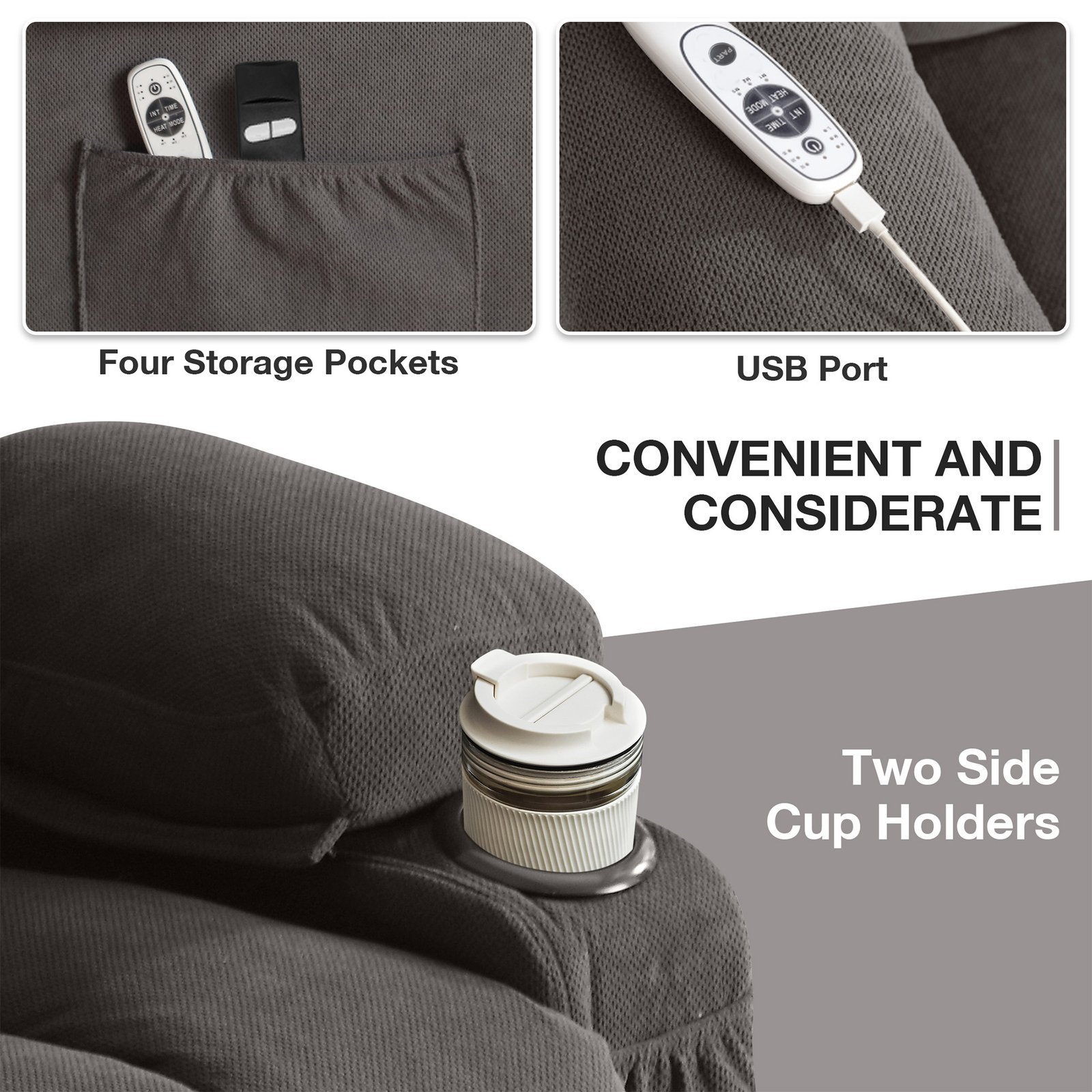 • 【THOUGHTFUL DESIGN】: The lift chairs recliners for elderly comes with two side cup holders, as well as two side pockets, which can be used to store items, such as water cups, magazines, remote controls, and other daily necessities, very convenient. The recliner sofa also comes with a USB port, which can charge your phone or other electronic products. The recliner’s remote control is easy to understand, you can easily adjust the massage function.
