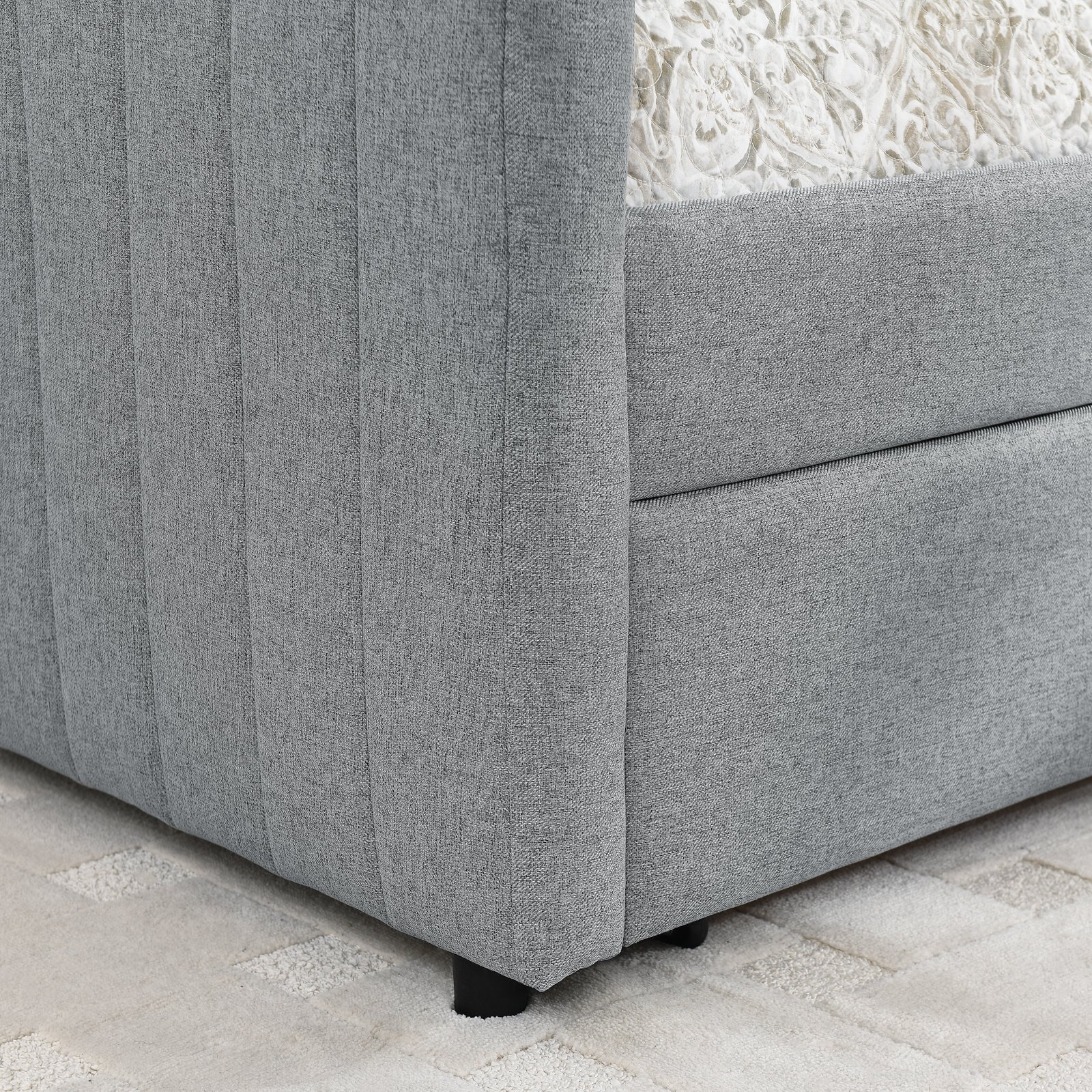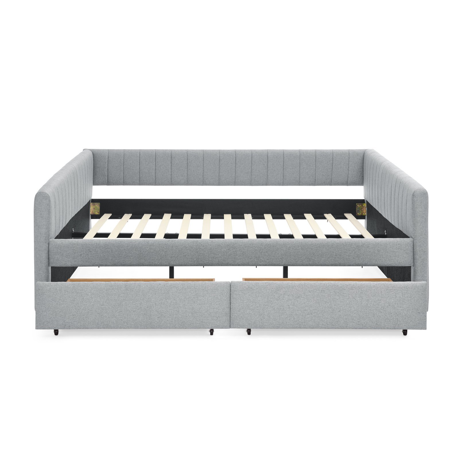 Queen Size Daybed with Two Drawers Trundle Upholstered Sofa Bed, with Vertical Stripes Linen Fabric, Grey (86.5″x65″x30″)