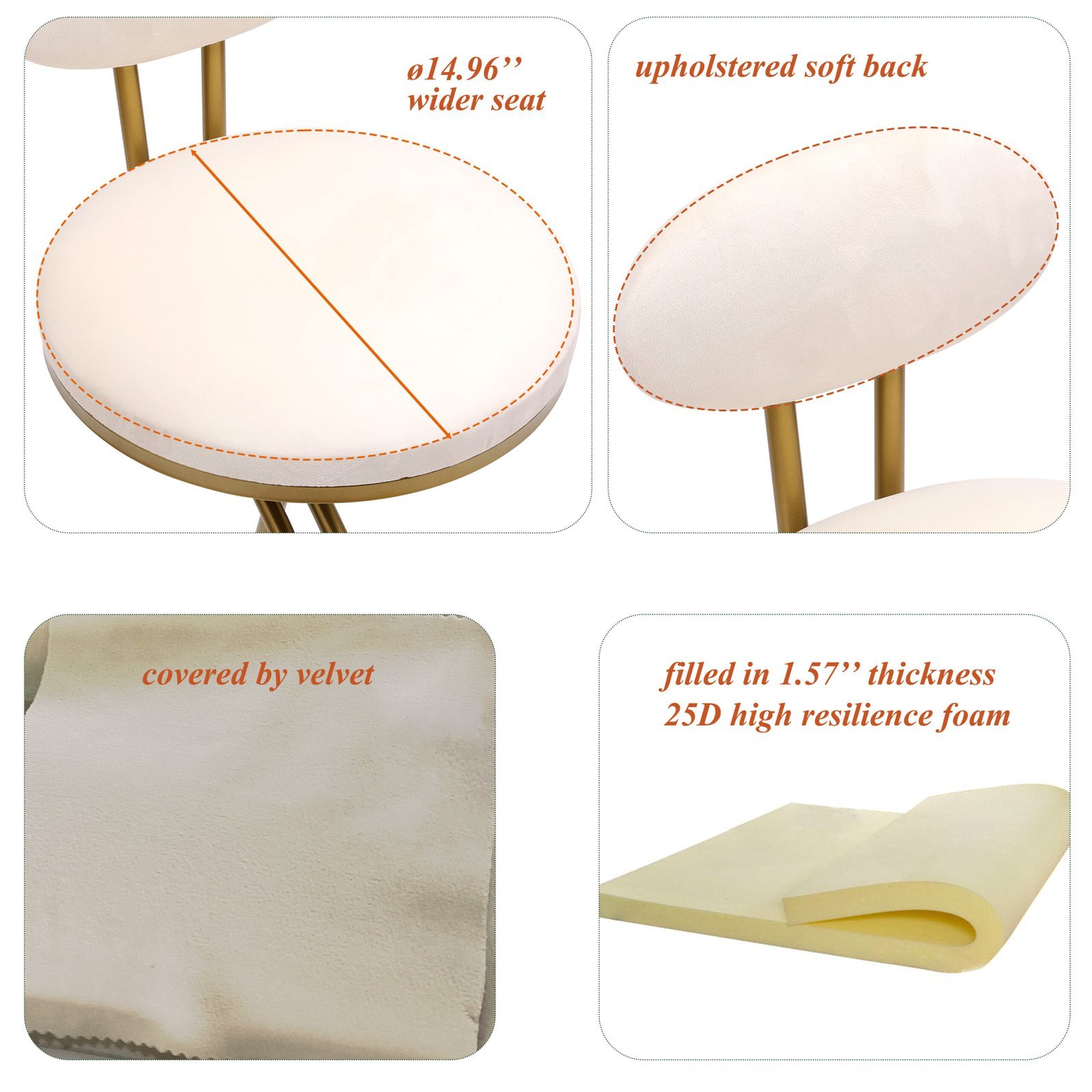 - Novelty Design: The bar stool applies an S-shaped golden metal frame with upholstered seat. The circle seat is covered by creamy white velvet and filled in 1.57 inches thickness 25D high resilience foam, provides a cozy seating experience. The upholstered back of this counter stool relaxes your body well, footrest is high enough for your feet to be well off the floor. The thickened metal frame and round base support max 220LBS (100kg) weight.