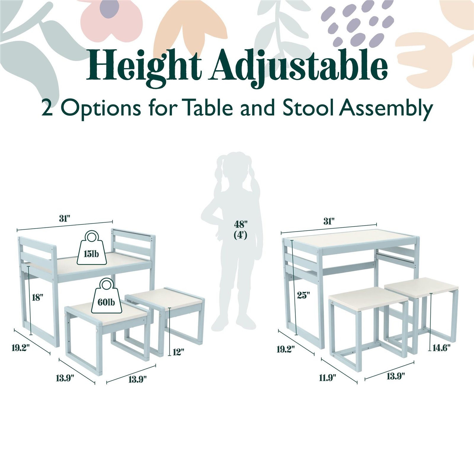 - GROW-WITH-ME ADJUSTABLE HEIGHT KIDS’ TABLE AND CHAIRS: Lightweight for portable room-to-room use, this 3-piece set is ideal for both toddlers and preschoolers with an adjustable height table (18″ or 25″) and chairs (12″ or 14.5″) that grow with your child.